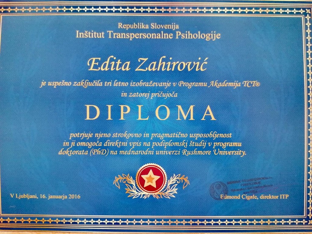 Sem Edita, po osnovni izobrazbi univerzitetna diplomirana socialna pedagoginja, zatem pa sem študirala na Akademiji za Transpersonalno kognitivno terapijo in tako postala terapevtka transpersonalne kognitivne terapije (TCT®). Naziv terapevtke TCT® sem pridobila na Akademiji TCT®, ki poteka preko Inštituta Transpersonalne Psihologije v Sloveniji.
