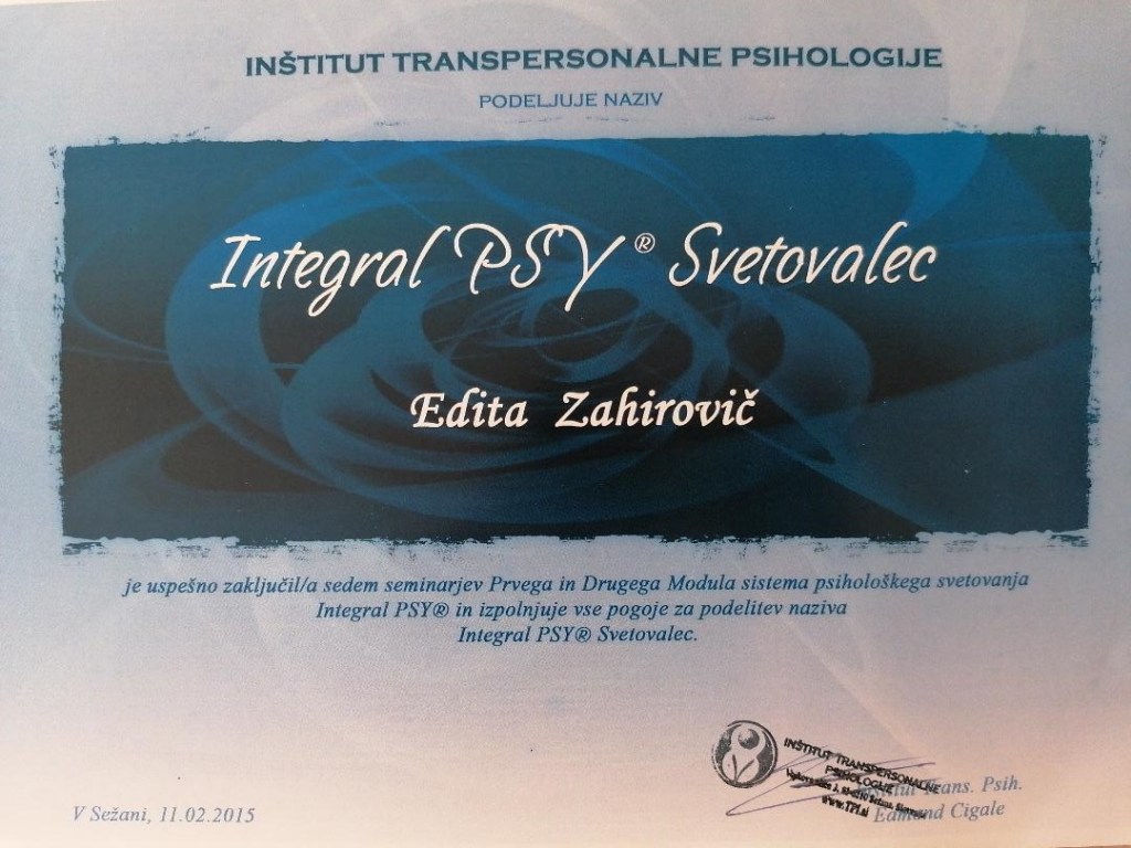 I was also educated at various seminars and workshops in the field of helping people, psychology, psychotherapy, such as: 9th E-child abuse conference, NVC (Nonviolent Communication), Reiki, seminar Children with behavioral disorders, etc.